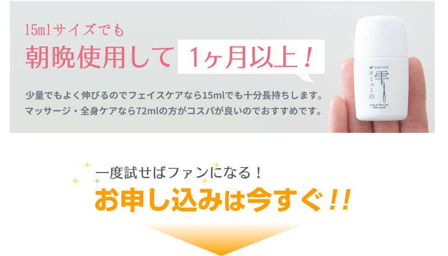 そんな方に選ばれているのが、100%天然無添加のエミューオイル「エミューの雫」です。